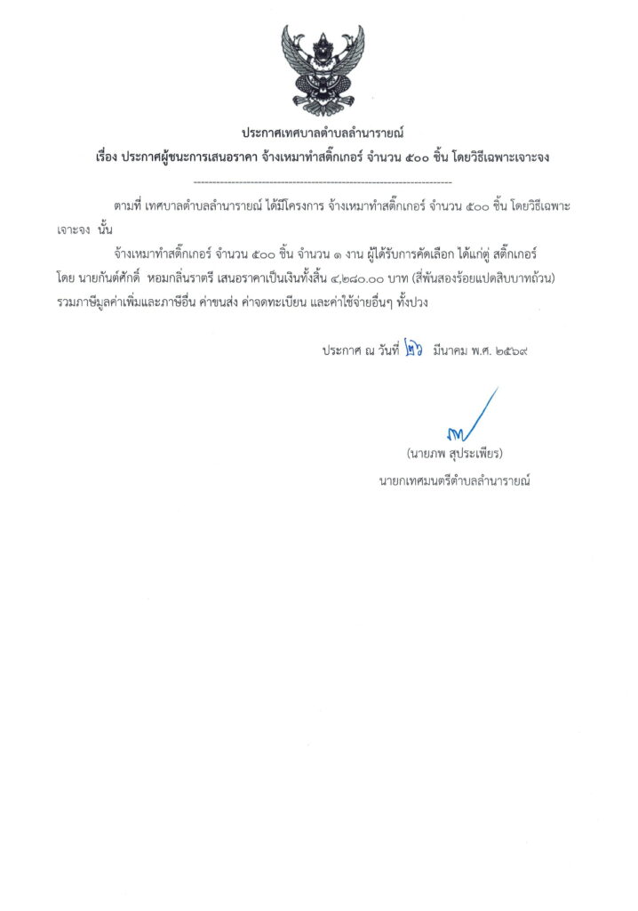 ประกาศผู้ชนะการเสนอราคา จ้างเหมาทำสติ๊กเกอร์ จำนวน 500 ชิ้น โดยวิธีเฉพาะเจาะจง ประกาศผู้ชนะการเสนอราคา 26 มีนาคม 256930 มีนาคม 2026 lamnaraicity@2021 FacebookFacebookXTwitterLINELine