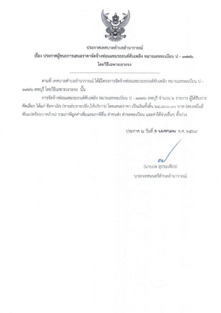 ประกาศผู้ชนะการเสนอราคาจัดจ้างซ่อมแซมรถยนต์ดับเพลิง หมายเลขทะเบียน ป-3776 โดยวิธีเฉพาะเจาะจง ประกาศผู้ชนะการเสนอราคา 1 เมษายน 25691 เมษายน 2026 lamnaraicity@2021 FacebookFacebookXTwitterLINELine