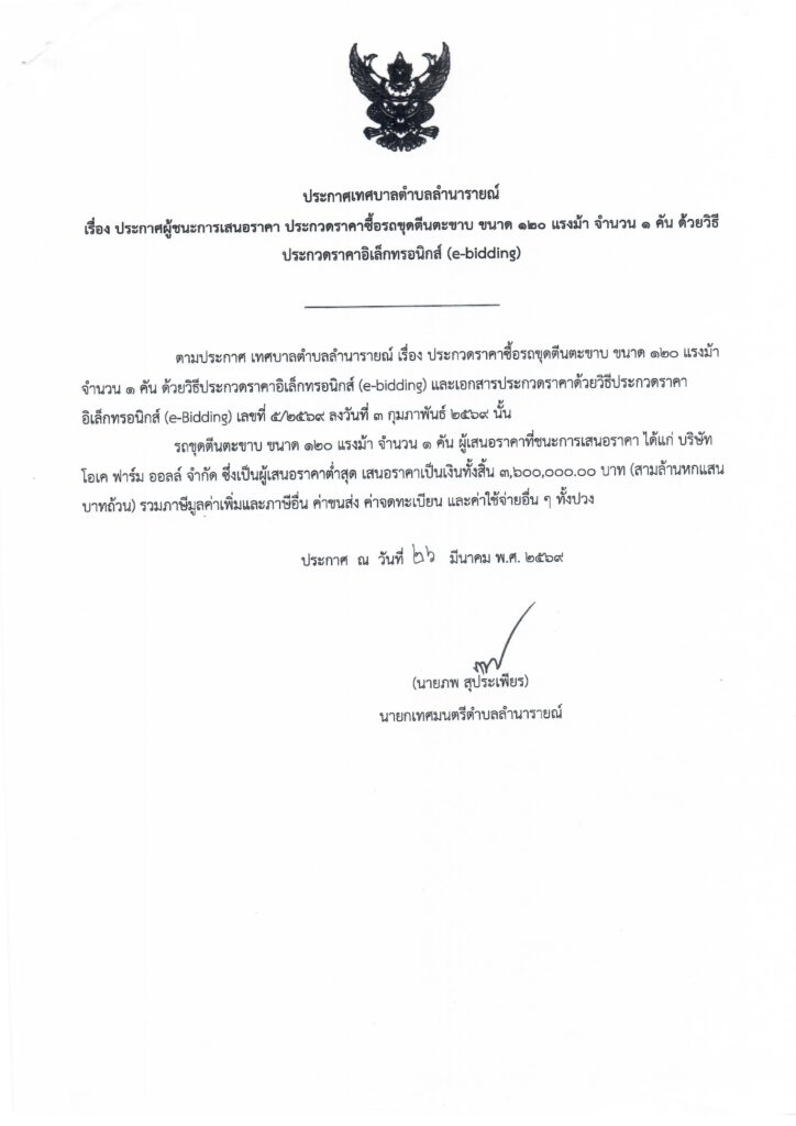 ประกาศผู้ชนะการเสนอราคา ประกวดซื้อรถขุดตีนตะขาบ ขนาด 120 แรงม้า จำนวน 1 คัน ด้วยวิธีประกวดราคาอิเล็กทรอนิกส์ (e-bidding) ประกาศผู้ชนะการเสนอราคา 26 มีนาคม 25692 เมษายน 2026 lamnaraicity@2021 FacebookFacebookXTwitterLINELine
