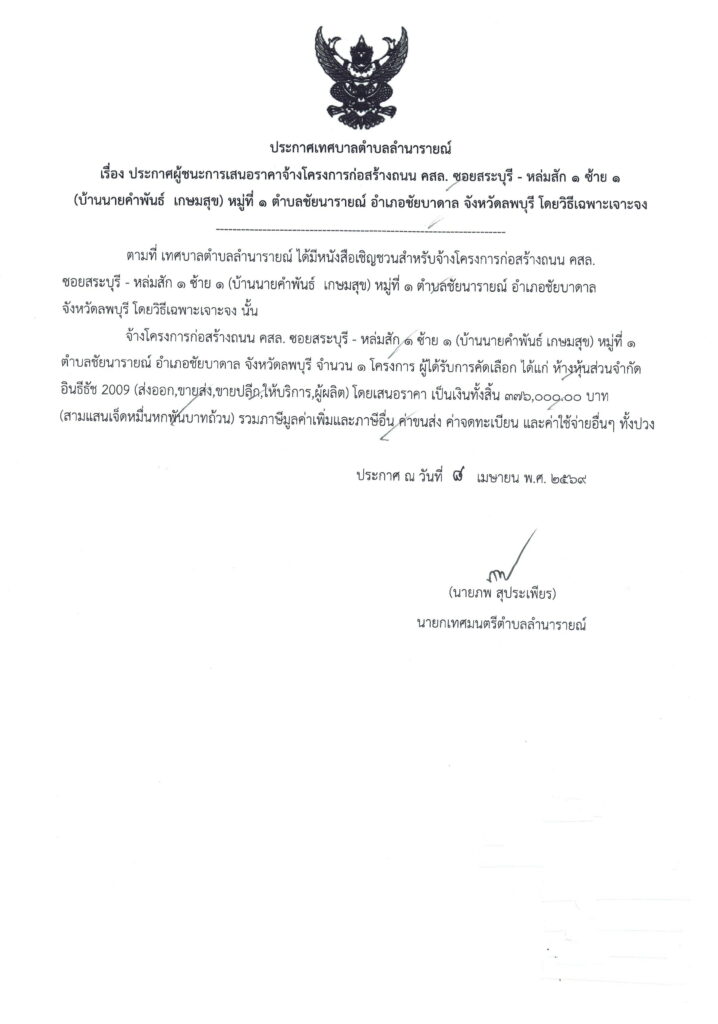 ประกาศผู้ชนะการเสนอราคาจ้างโครงการก่อสร้างถนน คสล. ซอยสระบุรี – หล่มสัก 1 ซ้าย 1 (บ้านนายคำพันธ์ เกษมสุข) หมู่ที่ 1 ตำบลชัยนารายณ์ อำเภอชัยบาดาล จังหวัดลพบุรี โดยวิธีเฉพาะเจาะจง ประกาศผู้ชนะการเสนอราคา 8 เมษายน 25698 เมษายน 2026 lamnaraicity@2021 FacebookFacebookXTwitterLINELine