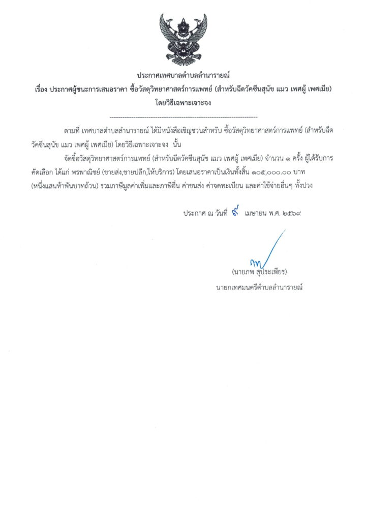 ประกาศผู้ชนะการเสนอราคา ซื้อวัสดุวิทยาศาสตร์การแพทย์ (สำหรับฉีดวัคซีนสุนัข แมว เพศผู้ เพศเมีย) โดยวิธีเฉพาะเจาะจง