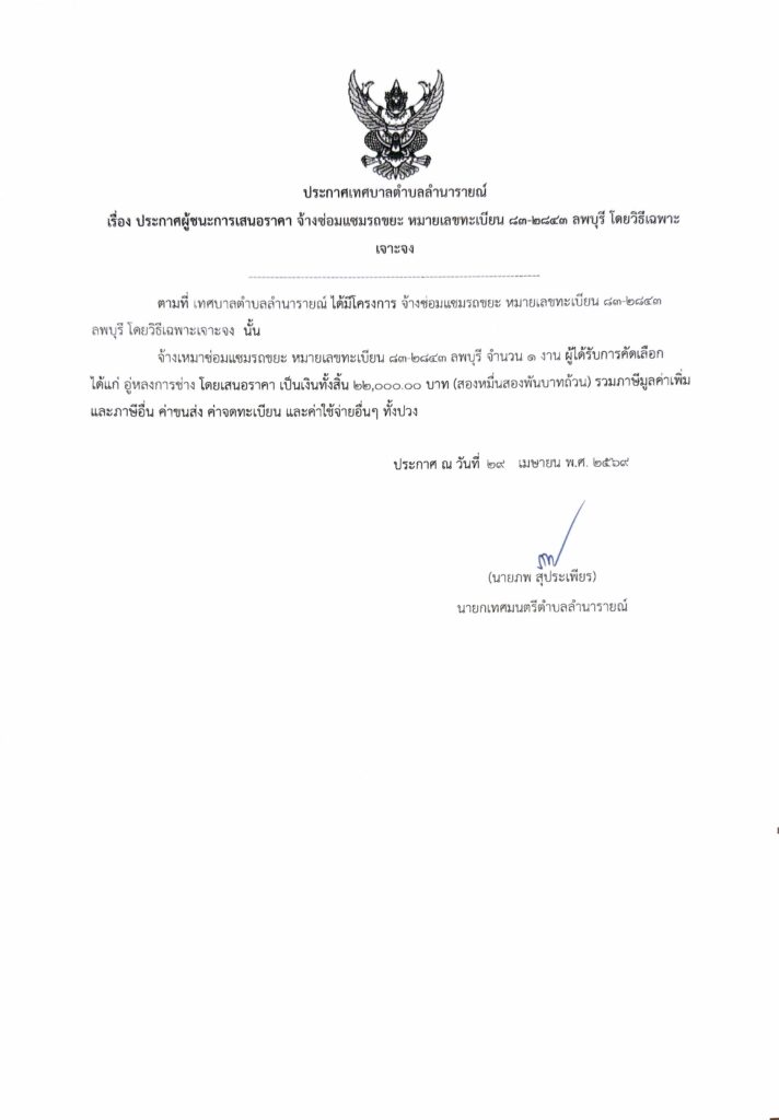 • ประกาศผู้ชนะการเสนอราคา จ้างซ่อมแชมรถขยะ หมายเลขทะเบียน 83-2843 ลพบุรี โดยวิธีเฉพาะเจาะจง
