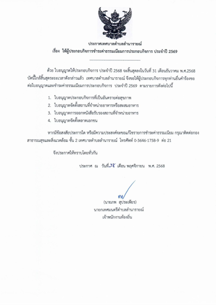 ประกาศเทศบาลตำบลลำนารายณ์ เรื่อง ให้ผู้ประกอบกิจการชำระค่าธรรมเนียมการประกอบกิจการ ประจำปี 2569 ข่าวประชาสัมพันธ์ 3 ธันวาคม 25683 ธันวาคม 2025 lamnaraicity@2021 FacebookFacebookXTwitterLINELine