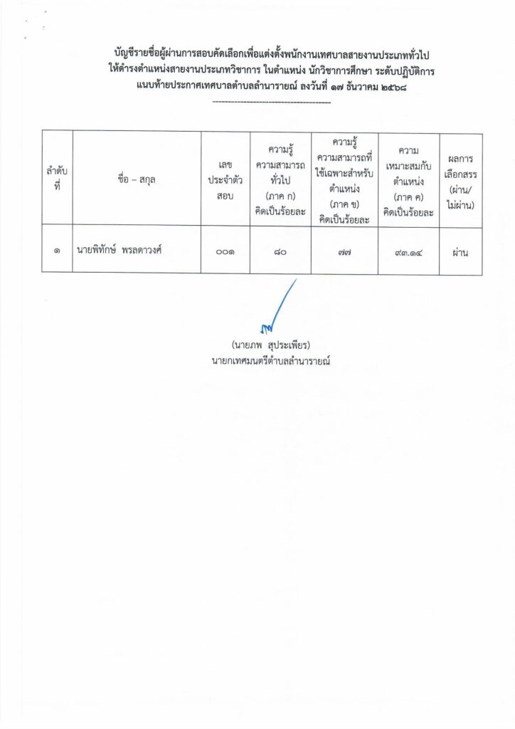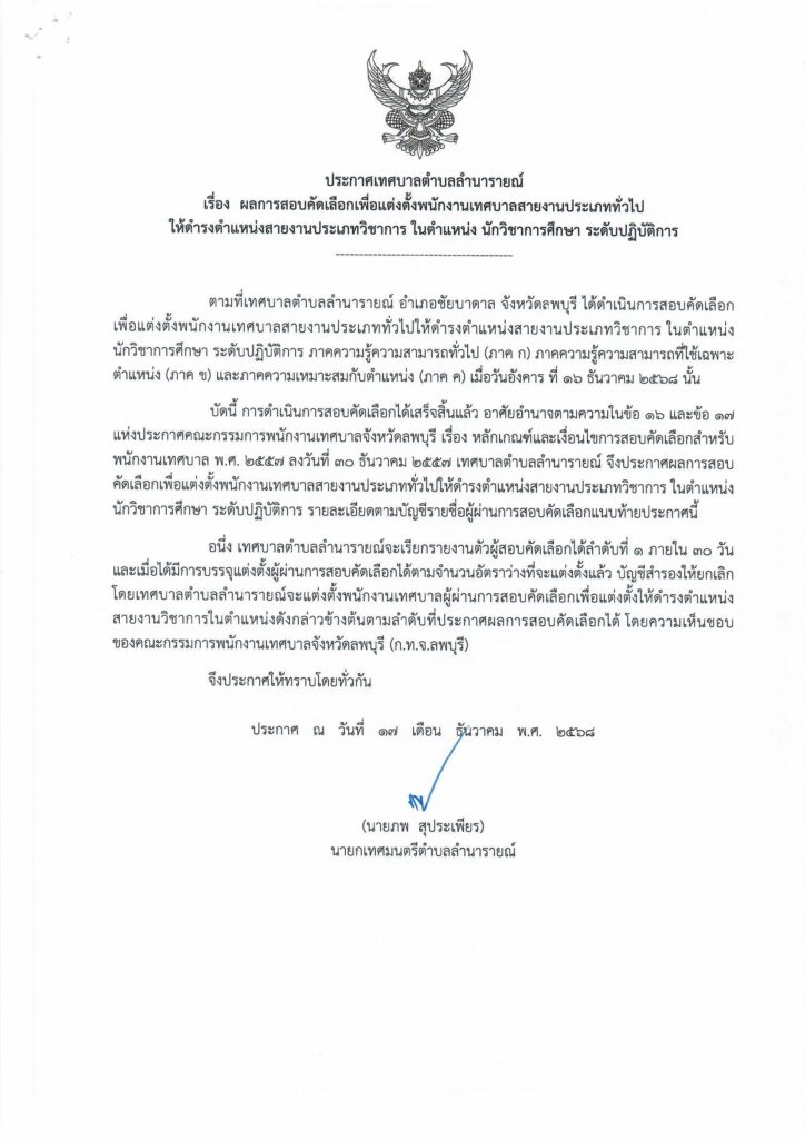 ประกาศเทศบาลตำบลลำนารายณ์เรื่อง ผลการสอบคัดเลือกเพื่อแต่งตั้งพนักงานเทศบาลสายงานประเภททั่วไปให้ดำรงตำแหน่งสายงานประเภทวิชาการ ในตำแหน่ง นักวิชาการศึกษา ระดับปฏิบัติการ