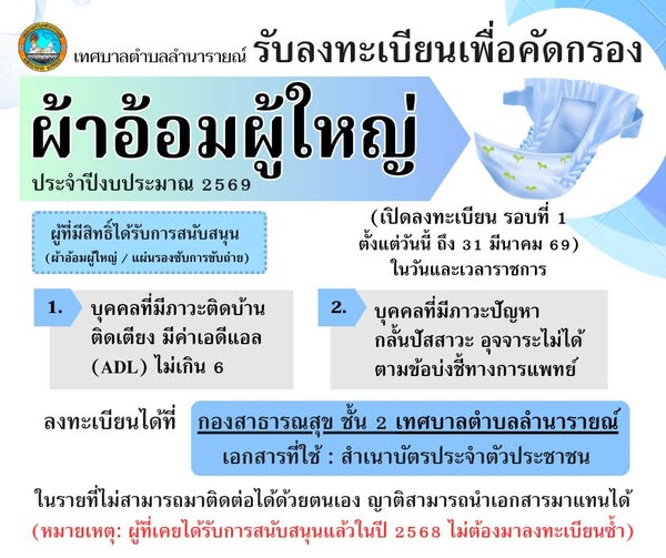 เทศบาลตำบลลำนารายณ์ ขอประชาสัมพันธ์บุคคลในเขตเทศบาลตำบลลำนารายณ์ เพื่อคัดกรองคุณสมบัติผู้ที่มีสิทธิ์ได้รับผ้าอ้อมผู้ใหญ่ หรือ แผ่นรองซับการขับถ่าย![]()
