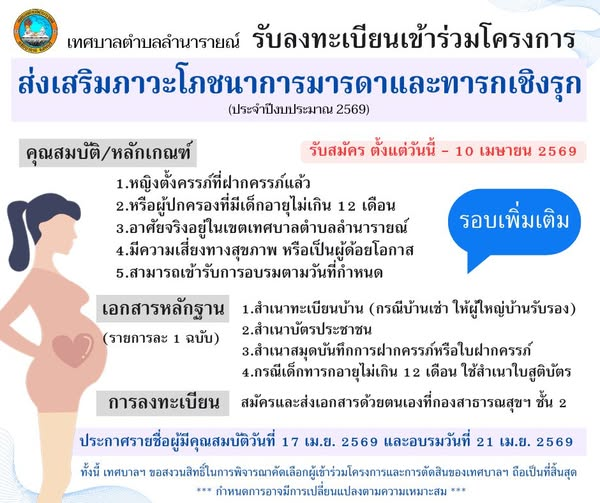 เทศบาลตำบลลำนารายณ์ ขอประชาสัมพันธ์บุคคลในเขตเทศบาลตำบลลำนารายณ์ เพื่อคัดกรองคุณสมบัติผู้ที่มีสิทธิ์เข้าร่วมโครงการส่งเสริมภาวะโภชนาการมารดาและทารกเชิงรุก![]()